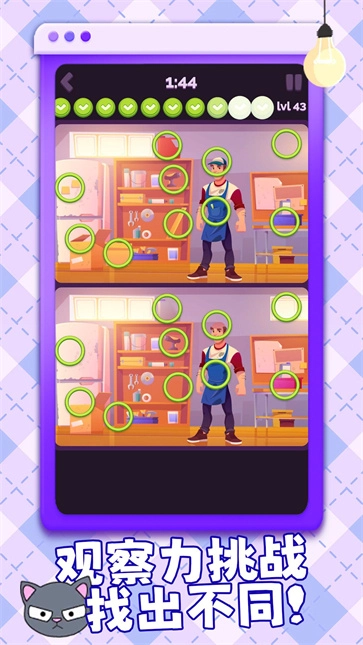 找不到吧这款游戏,整体操作玩法较为简单,但对玩家的眼力却是个极大的挑战。除此之外,游戏中为玩家准备了超多各式各样的道具,这些道具能大幅提升找茬效率,助力玩家快速完成更多关卡挑战。