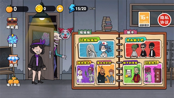 2、在经典躲猫猫玩法里,有着超多可供游玩的地图场景,比如宿舍、街道、医院等。玩家选好地图后,还得挑选游戏中的角色。角色选择成功后,玩家还能挑选游戏内的道具,不过这需要观看视频才行。