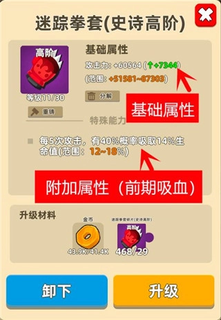 4、装备主要具备两大属性,其一是基础属性,其二为附加属性。基础属性涵盖武器的攻击力、衣服的血量以及帽子的减伤。而附加属性则包含吸血、持续伤害、暴击等等。