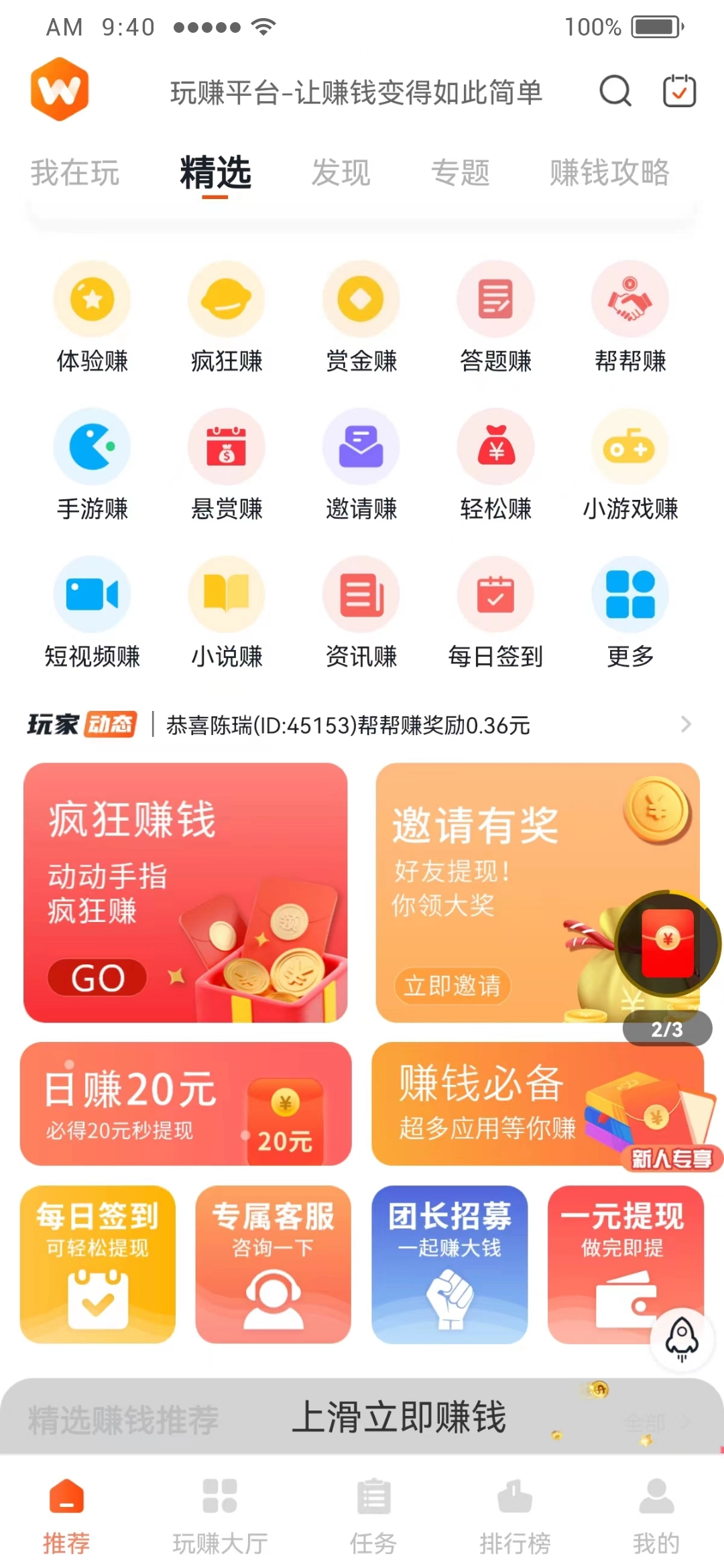 5、赚取:完成赚取任务,即刻就能获取现金奖励。