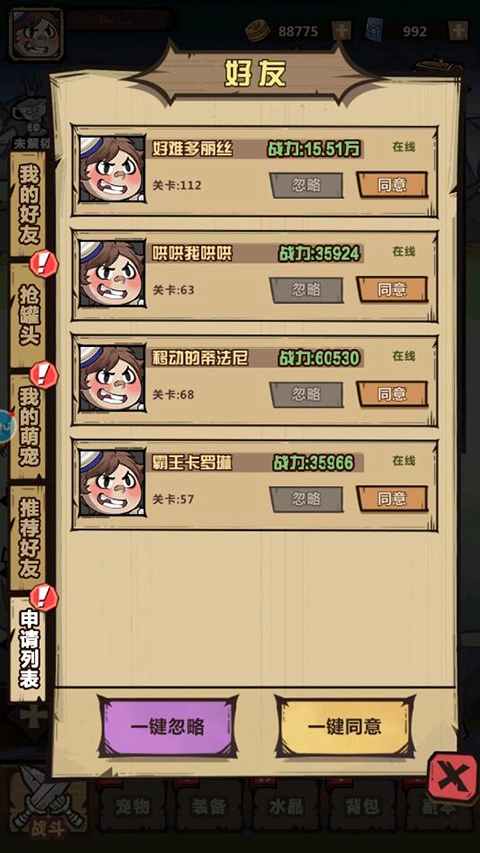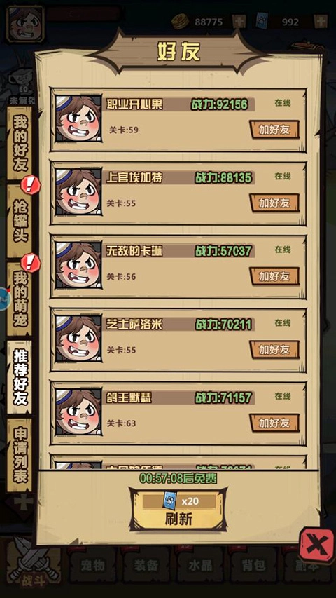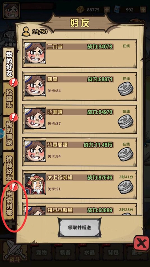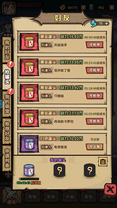 6、成功添加好友后,就能参与抢罐头的玩法啦。就像下面这张图展示的,大家可以选择战力较低的好友来展开抢夺。