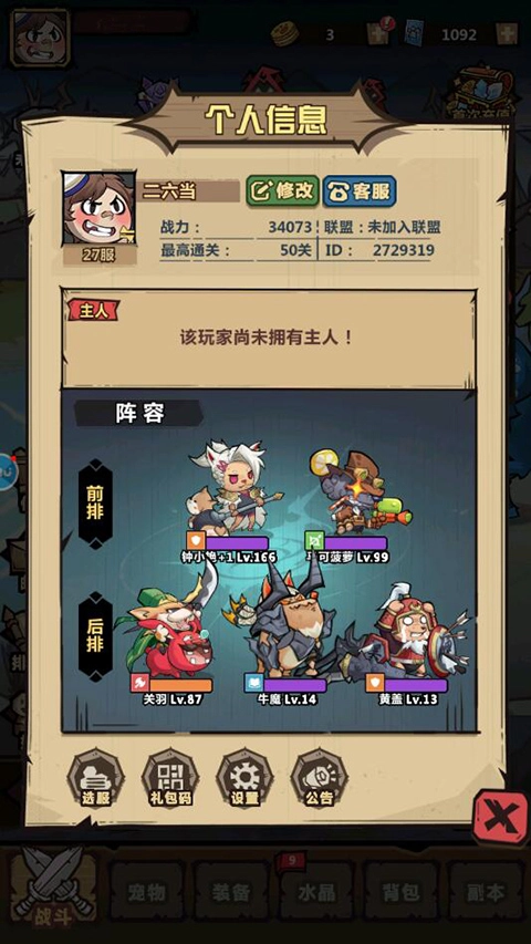 2. 当进入游戏的个人信息界面后,点击界面下方的礼包码按钮。
