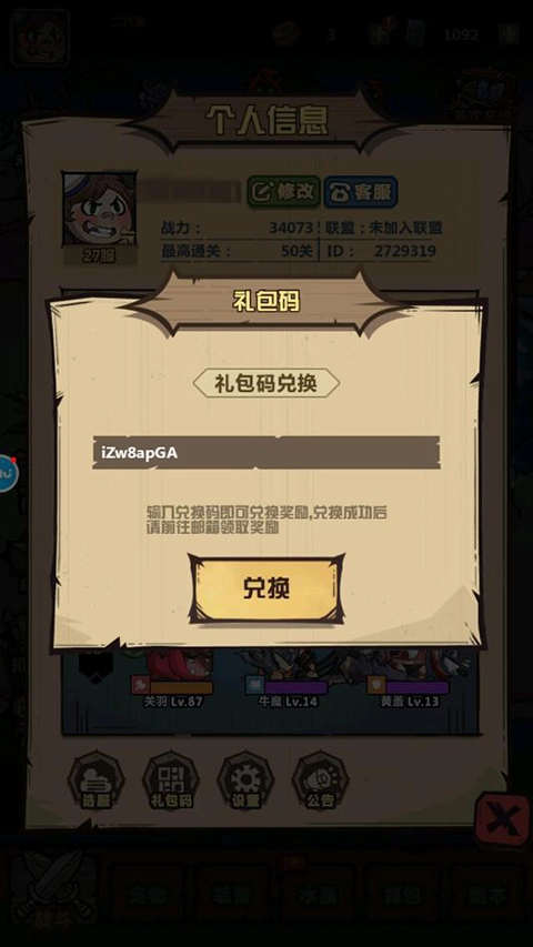 3、输入你所获取到的礼包码,小编在此为大家整理了两个可用的礼包码:iZw8apGA、TnZf1hV9