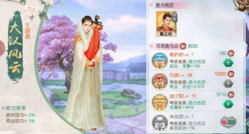 每位妃子皆拥有专属的【势力效果】以及与之对应的【势力名臣】。