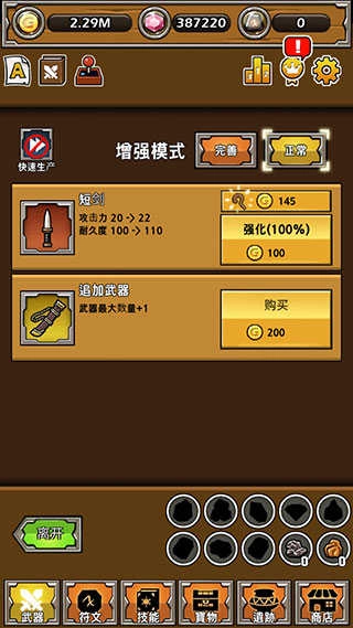 1、【武器】:在此处,玩家能够查看自身当前持有的武器状况,同时还能够对武器进行强化操作,或者购买新的武器。