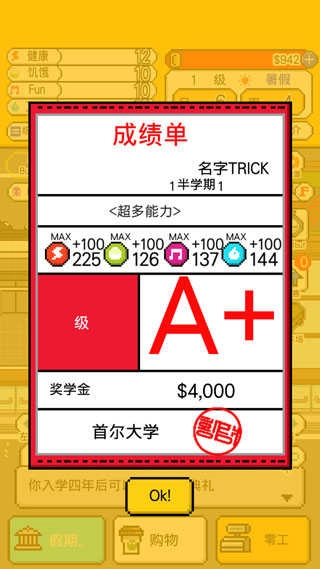 一学期圆满落幕咯,又到了揭晓成绩的时刻,玩家在这儿就能瞧见自己的成绩单。嘿,我这次拿到了A+,感觉超棒的(小小自夸一下嘿嘿)。通过这学期学习,各方面能力都有所提升,这就是学习带来的益处呀。要是成绩优异,还能收获丰厚的奖学金呢,就像我这次得了A+,拿到了4000美元,真不错!