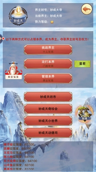 在凡间之上存在三界,分别是33个天界、19个地狱和15个魔界,总计67个小世界。每个小世界都设有界主之位,并且这些世界本身也划分了不同的星级。所有玩家都能够参与界主的争夺,只要挑战成功就能获取征服度,只有当征服度积累到满值时,才具备成为界主的资格。界主所需的进度计算公式为:世界星级乘以100,比如一星的梵度天需要100进度,而九星的玉皇天则需要900进度。