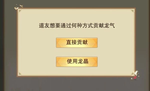 除了直接贡献自身10%的龙气外,道友还能以捐献龙晶的形式为宗门增添龙气,每颗龙晶可提升2点龙气。