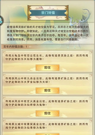 每百年(一日)开启一次狩猎契机,成功击败对应的首领后,所获的战利品是可使宗门矿脉与修炼场获得额外成长点数的特殊器物。