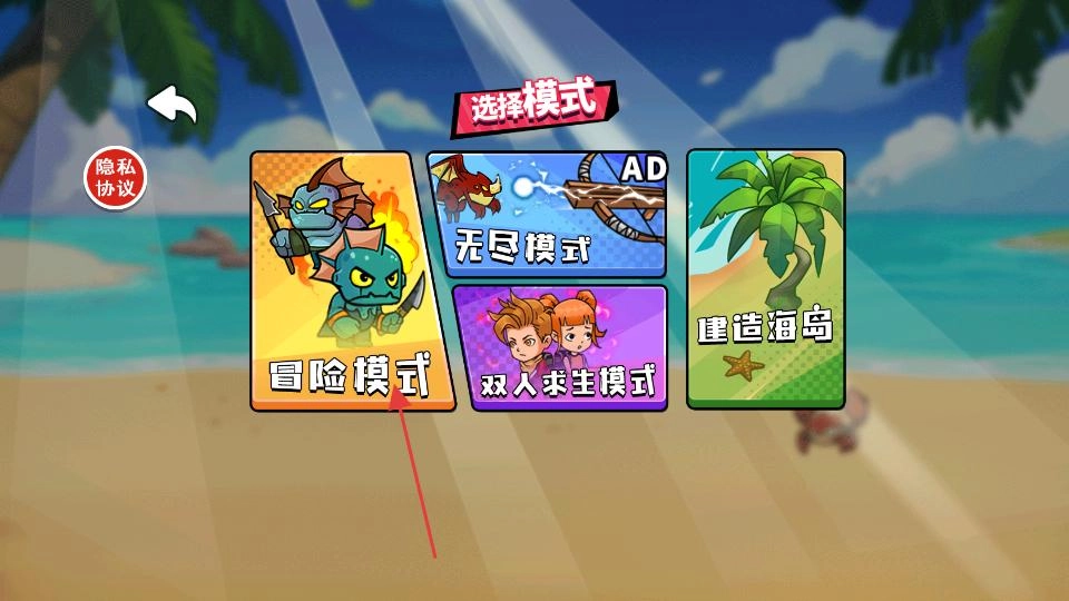进入游戏初始界面后,映入眼帘的是海滩场景和游戏开始按钮,按照红色箭头的指引点击这个按钮,就能触发模式选择界面的加载,为挑选玩法做好准备。