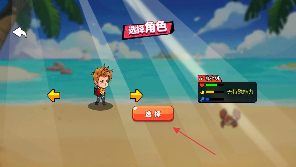 进入角色选择界面后,你会看到可供选用的角色及其属性介绍。接下来,请按照红色箭头所指的方向,点击对应的选择按钮,确认你心仪的角色。完成这一步后,你就能开启充满惊喜的海岛冒险之旅,尽情探索游戏中的丰富内容了。