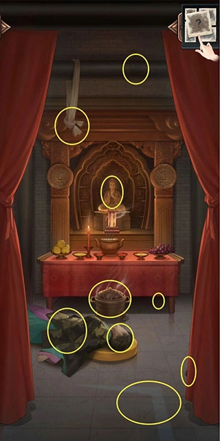 选择:白色残渣、神龛里的佛像、一颗翡翠佛珠、第三条白绫、第三只手印、谢金娥的尸体、地上的烛台、谢金娥的脖颈以及虚掩的房门。