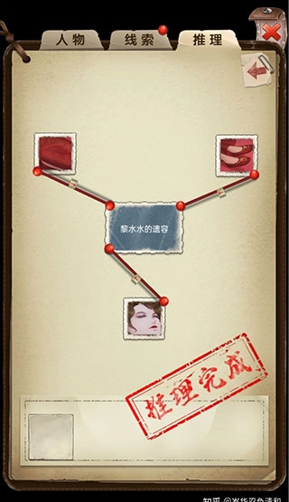 选择:悬梁的白绫、一匹白绫、红色旗袍、一双红绣鞋、锁着的窗户、死者的妆容、房梁上的黑手印、黎水水脖颈上的勒痕以及被踩倒的方凳。