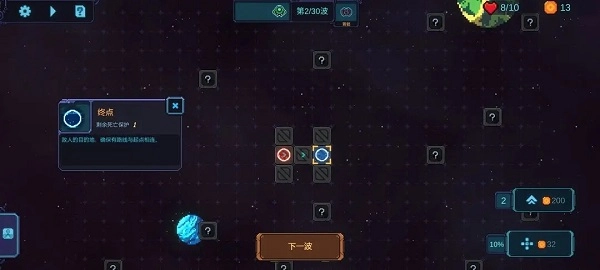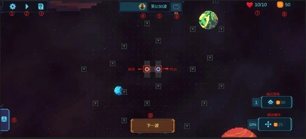 下一波:发起战斗的信号。点击后将无法再进行构建、合成重构塔等操作,仅可点击重构塔进行升级,请谨慎考虑后再点击。