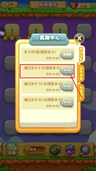 可以在【奖励中心】里查看各项任务的进度情况,比如“通过关卡3次”这类任务,假设当前进度显示为2/3,那么等完成全部次数后就能领取到100金币。建议优先去推进新关卡相关的任务,这样能更快获取奖励。