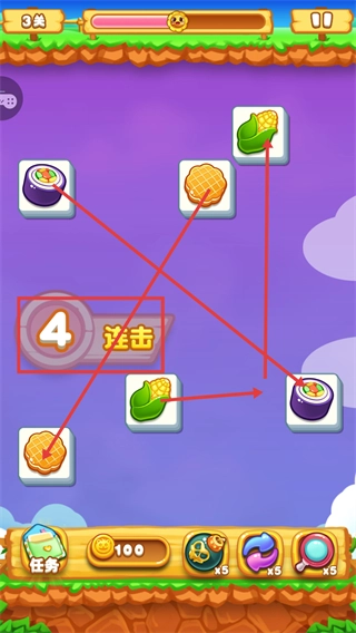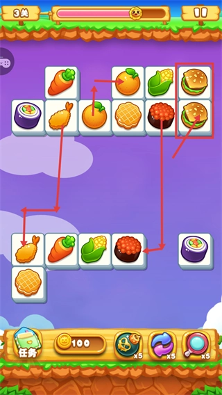 在关卡里要优先匹配像【汉堡】这类相同的物品,并且留意物品的分布情况,借助连线消除的方式来积累进度,以此提高消除的效率。