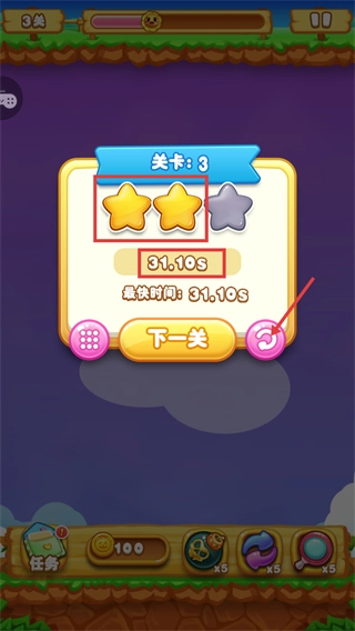 通关后获得【2星】评价和【31.10s】的最快时间记录,要是想提高星级,可以点击【重玩】按钮来优化消除节奏,也能选择【下一关】继续进行挑战。