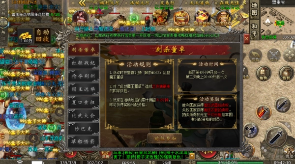 刺杀董卓新区每40分钟开启一次,次日晚上20:00额外开启一次。活动期间,皇宫北掖门会刷新BOSS乱世魔王董卓,玩家只要在活动地图内累计停留时间达到或超过2分钟,就能获得奖励分配资格。
