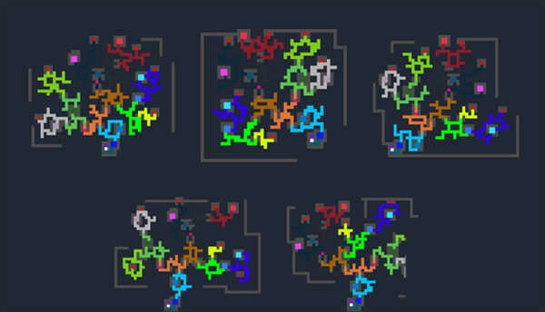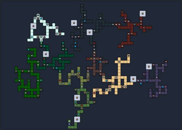 游戏每次启动都会重新生成一张整体构造的大地图,大部分格子是野外区域,玩家能在野外打怪获取素材、积累金币,还可以自由穿梭其中。地图上不同颜色对应不同生物群落,像白色代表雪山、绿色代表丛林、黑色代表洞穴。