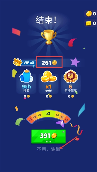 比赛结束后你将获得261枚金币,此时有两个选择:一是观看广告让奖励翻倍,二是点击“不用,谢谢”直接领取基础数量的金币。