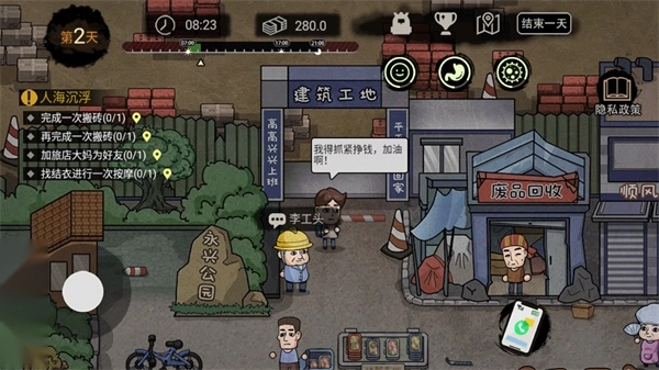 玩家得去探索地图,寻找新的工作机会,尽力赚取更多收入来让自己的家庭生活变得更好。