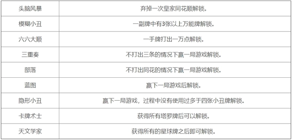 游戏里的牌组类型丰富多样,除了系统一开始就赠送的那些,剩下的大部分小丑卡牌都得玩家自己去解锁,具体的解锁方式如下。