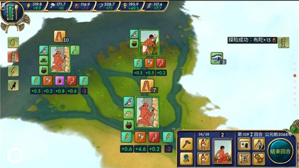 推荐策略是先把人口补充到上限,再发展农业,工业放在后面,最后再探索地图。这是因为人口是本游戏的核心要素,文化增长也依托于人口。正因为人口如此重要,下一个科技我们会选择+1粮食的选项;要是简单模式的话,之后很快就会触发下雨事件。
