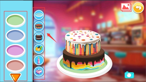 3、在制作界面中,从左右两侧选取喜欢的颜色和装饰元素来装扮蛋糕。