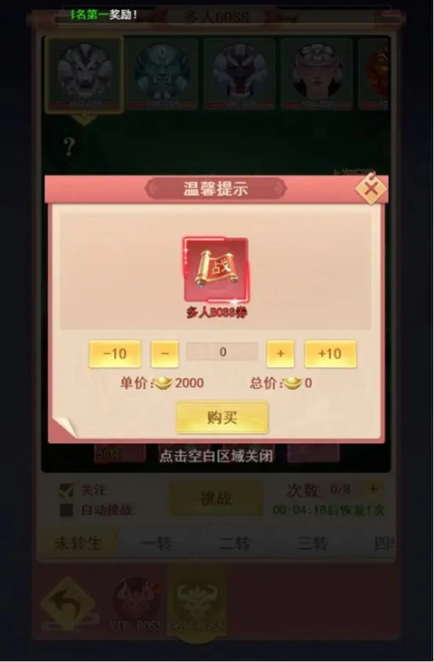 多人BOSS设有次数限制,每天提供8次免费挑战机会。当免费次数用完后,有两种方式可恢复次数:一是等待时间自动冷却,二是消耗元宝购买多人BOSS券,这样就能立即获取挑战次数。