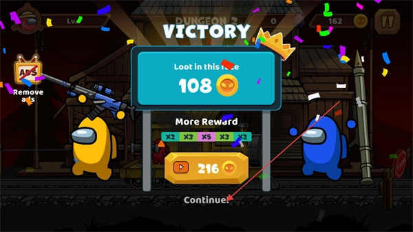 完成关卡后可获得金币奖励,点击“Continue!”按钮即可继续挑战下一关。