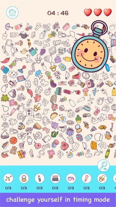 这是一款益智休闲的解压游戏,设有多种难度的关卡供玩家自由选择挑战,不同难度对应着各异的玩法。游戏采用有趣的绘画风格,每一关都藏有不同的物品等待玩家去寻找,完成任务后还能获得丰富多样的奖励。