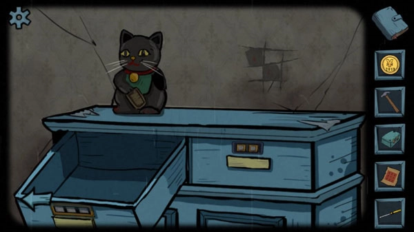 8、此时猫眼会显示“ME”的信息,从柜子上获取钥匙和白猫手臂,将手臂安装到猫猫身上后,就能抱走小猫猫了。