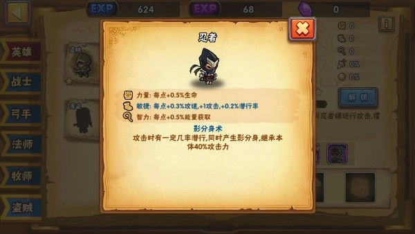 忍者和刺客属于略有区别的分支,其核心输出依赖本体与影分身的协同作战。由于潜行状态能显著提升攻击力,搭配影分身后,在盗贼系中甚至能成为输出天花板的存在。而弹射属性则使其适合针对群体敌人进行输出,除了可以和蛮锤、冰法配合外,在队伍前方或转角位置也是相当合适的选择。