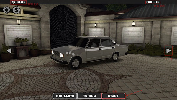 1、进入游戏后,呈现出的是一个选车界面。画面中央展示的是待驾驶的车辆,左上角显示玩家当前持有的金币数量,右上角标注着该车辆对应的金币价格。界面下方的“start”按钮用于启动游戏,而点击画面中央右侧的区域,则可以切换选择其他车辆。