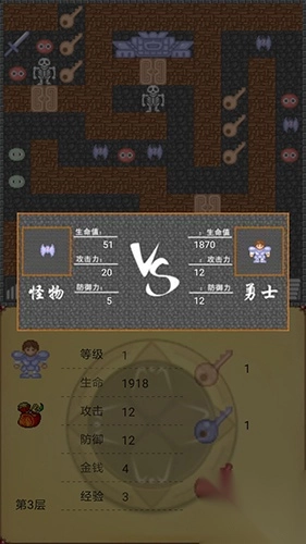 2、回合制:遇怪自动战斗,看敌人属性判断能否击败,优先打低防高掉落怪,避高攻怪。