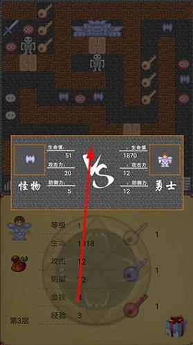 1、借助虚拟按键操控角色在魔塔中移动探索,踏上楼梯即可前往上层;遭遇怪物时会自动触发战斗,建议先查看敌人的属性信息,再判断是否发起攻击。
