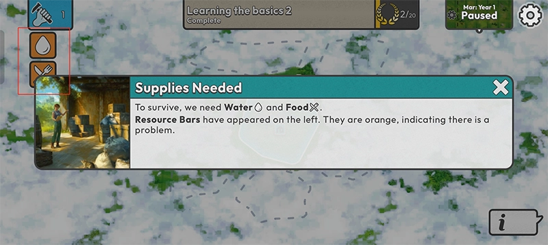 3、为了维持生存,我们离不开水和食物。画面左侧出现了资源条,它们呈现出橙色,这表明当前存在着问题。