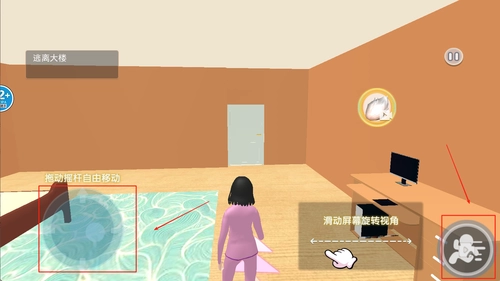 2、左边的控制区域用来调整移动方向,右边则设置了互动功能按钮;通过滑动屏幕能够查看周边环境,点击障碍物时可以对其进行推动操作,或者使用相应的道具。