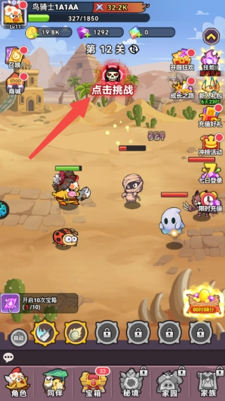 3、点击图示位置进行挑战,击败邪恶的敌人。