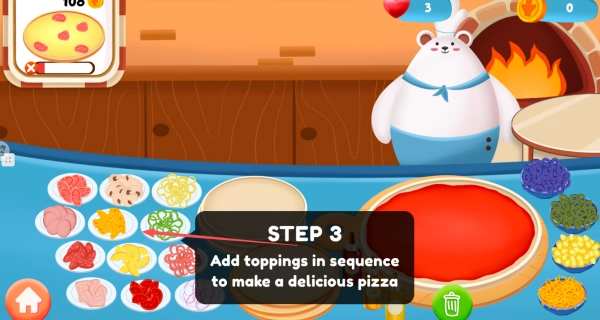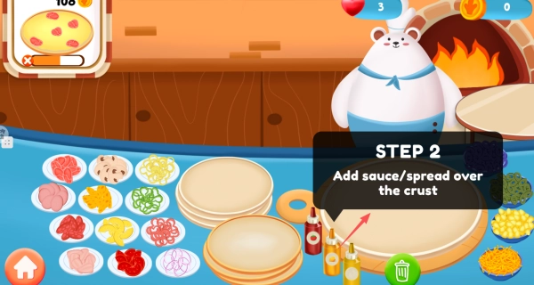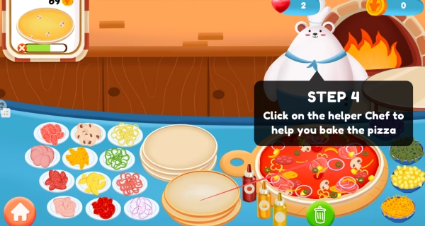 点击右侧的厨师熊,让它帮忙烤制披萨,完成披萨制作的最后一步。