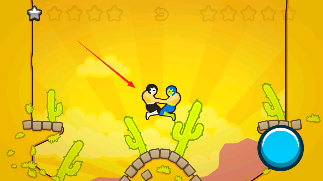 操控角色与对手扭打,在仙人掌地形间移动,借助跳跃跨越障碍维持格斗姿态,通过调整动作方向,争夺对战优势推进格斗进程。
