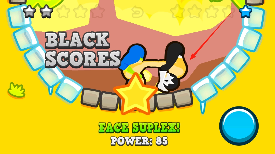 按下右侧蓝色按钮,触发角色跳跃,在对战中借跳跃时机将对手头部砸向地面,以此完成得分,开启摔跤对决的核心循环。