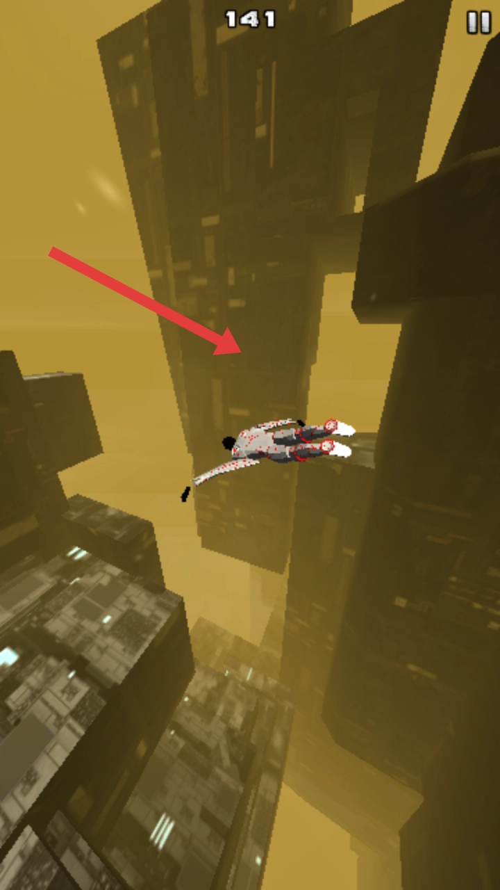 操控角色平稳的滑翔飞行,需要仔细观察附近的建筑,规划好自己的飞行路线,维持下坠节奏。