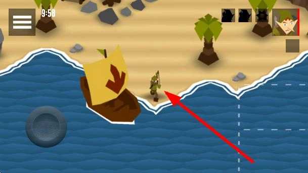 操控角色朝着红色箭头指向的陆地行进,离开帆船,在沙滩区域展开冒险,探索海岸废墟的秘密。