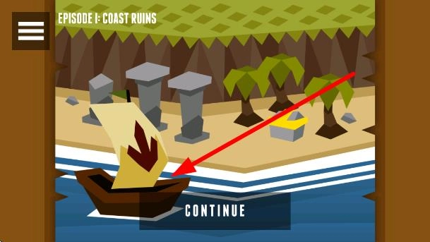 进入EPISODECOAST RUINS章节界面,看到帆船及场景,点击CONTINUE按钮,开始该章节的探索。