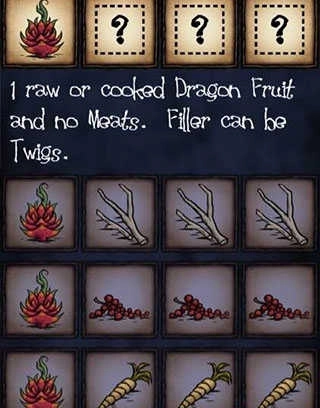 1颗火龙果搭配3份填充物,填充物可选树枝但不能用肉类,这是一款相当不错的食谱,搭配方式灵活自由,不仅保质期久,属性还很高,并且带有一定的升温效果。