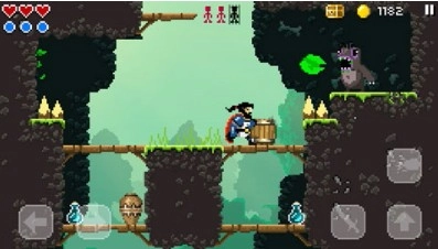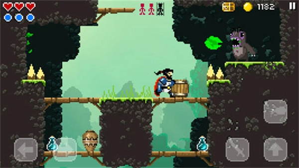 在游戏里,玩家拥有三条生命和三次释放技能的机会,沿途还会遇到各类怪物。战斗时玩家可能会出现血量不足的状况,这时只需使用药瓶补充血量就可以了。