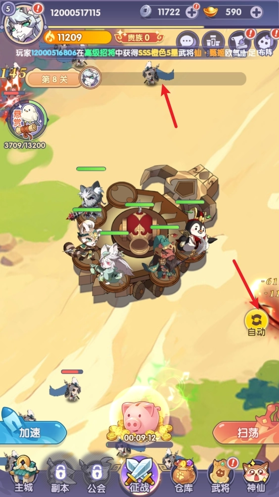 3、要是不想手动操作,点击右侧的“自动”按钮即可,上方会显示各关卡的进度情况。