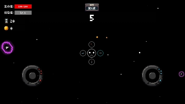 4.用轮盘操控小球在屏幕里移动,避开子弹、击败敌人,坚持到进入下一关。