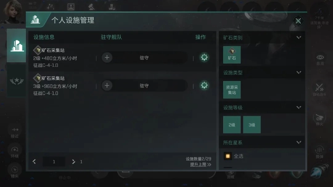 太空设施分为个人设施、先遣团设施和远征军设施,不同类型的太空设施的战斗难度和作用范围不同。个人设施是飞行员获得资源产出最主要的方式,先遣团设施将会提供各种加成,包括提升资源产出,战斗能力,视野范围等。